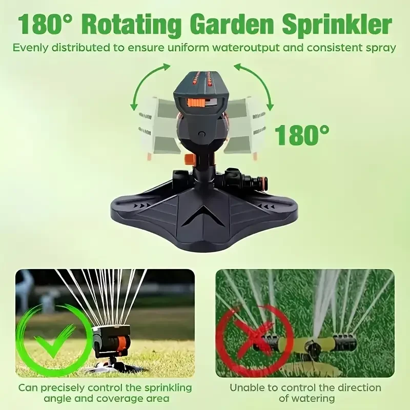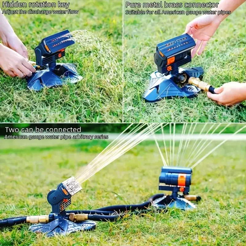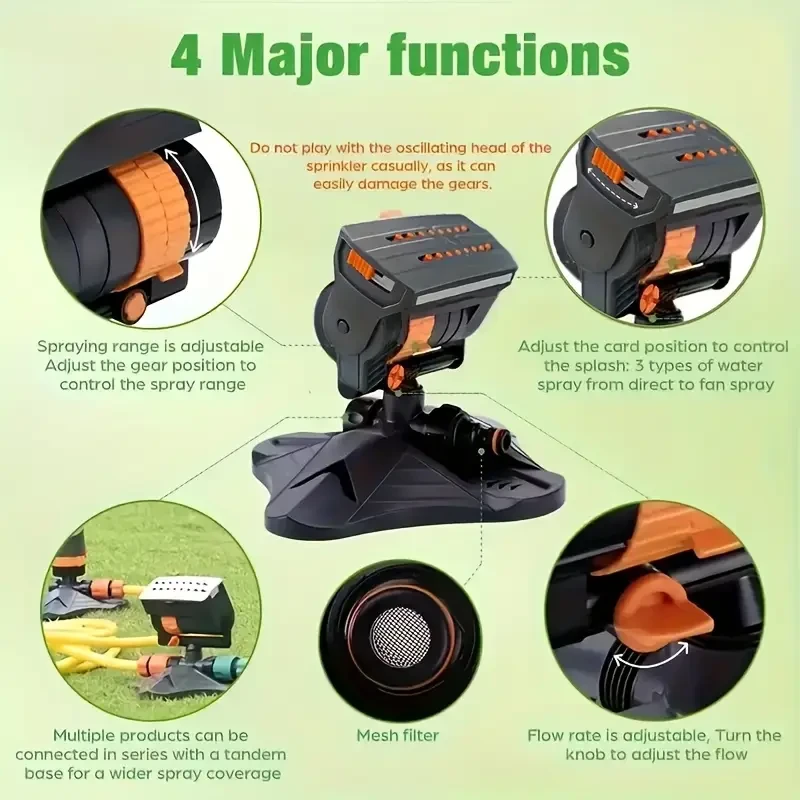 Adjustable sprinkler device for watering lawns, yards and gardens. 16 mini turbine oscillating sprinklers, covering larger sprinkler devices
