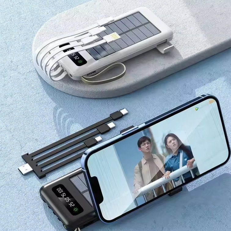 Black White Smart Lanyard Design 20000 Mah Solar Power Bank with Mobile Phone Holder 2 USB Output 1 to 4 Output Charging Cable