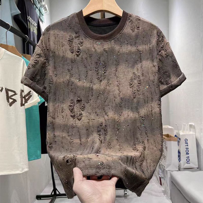 Men's Retro Distressed T-shirt, Torn T-shirt, Summer Loose Round-neck Short-sleeved Fashionable Rhinestone T-shirt