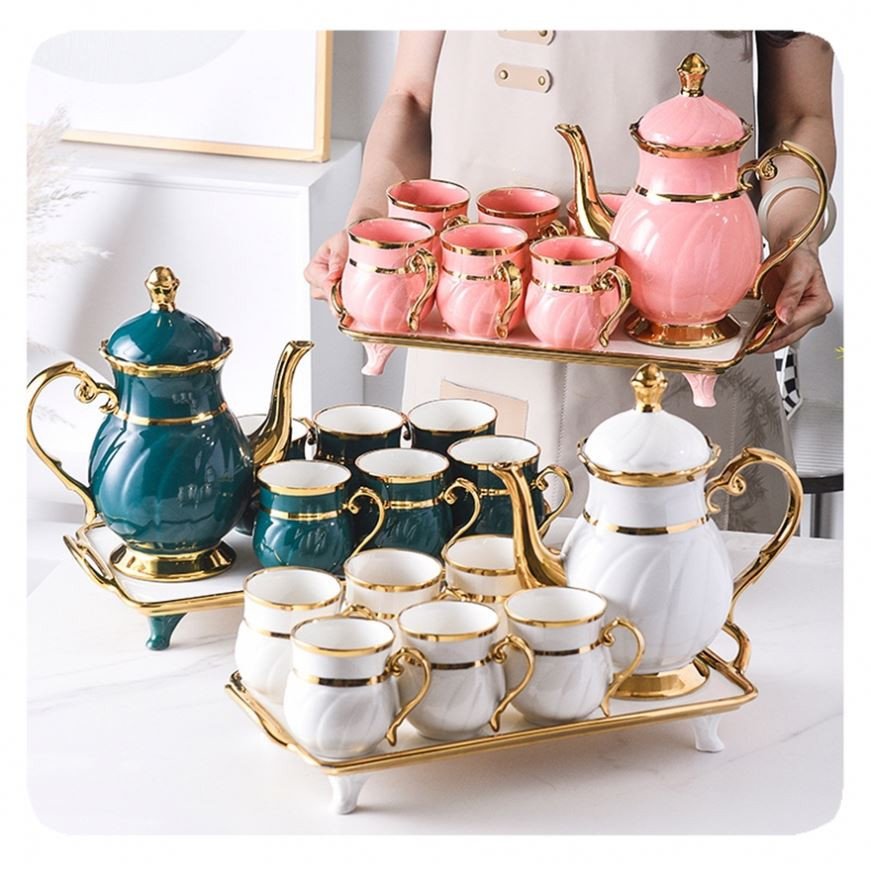 New Luxury 8Pcs Arabic Gold Rim Porcelain Coffee Tea Cup Set With Teapot Tray Ceramic Tea Cup Set