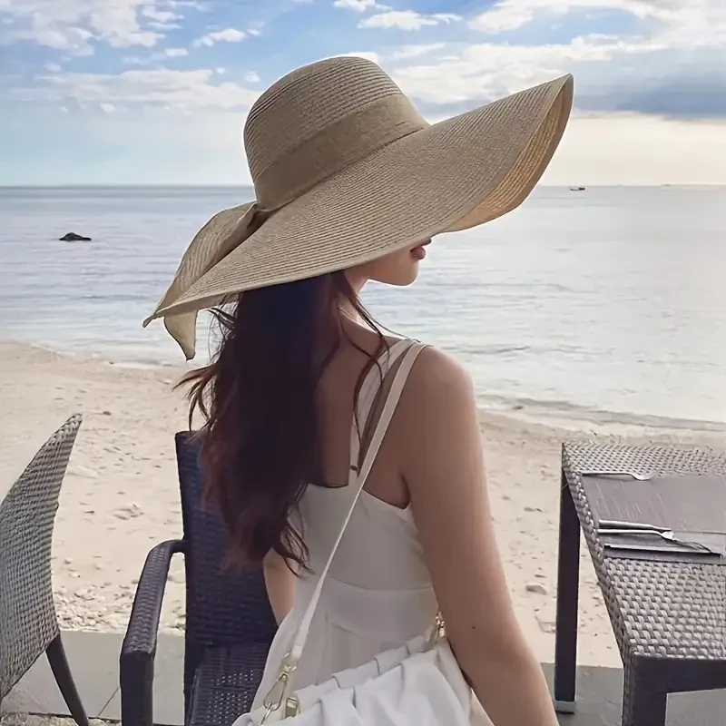 1pc Summer Outdoor Straw Hat for Women - Large Brim Beach Hat with Ribbon Bow, Foldable, Lightweight & Portable