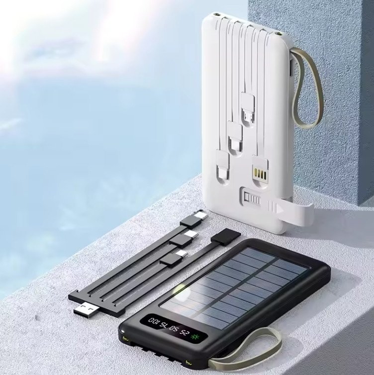 Black White Smart Lanyard Design 20000 Mah Solar Power Bank with Mobile Phone Holder 2 USB Output 1 to 4 Output Charging Cable