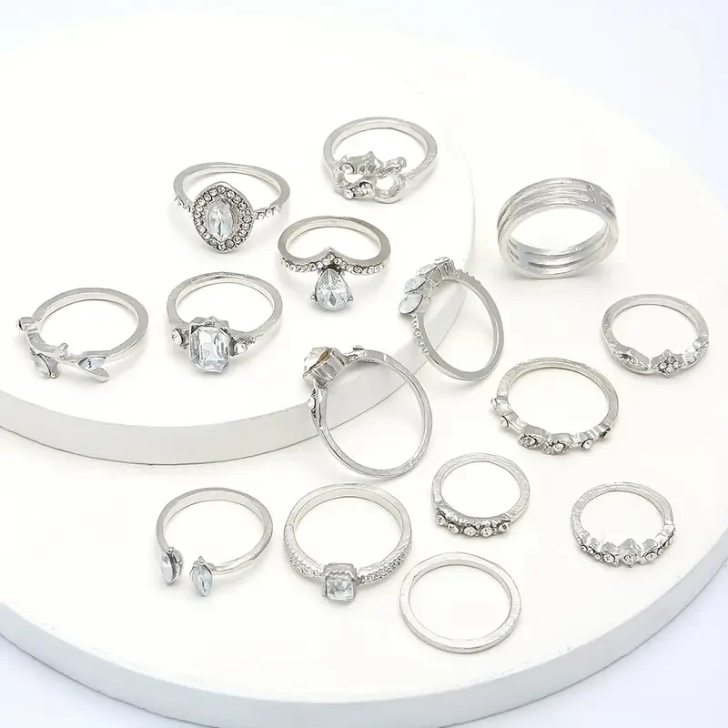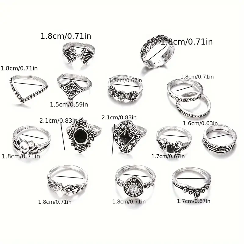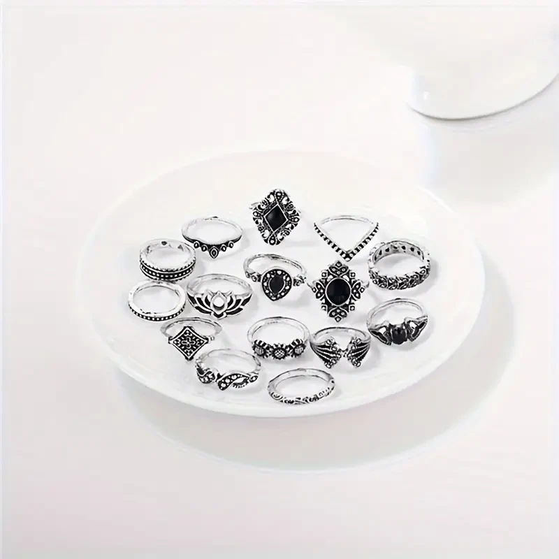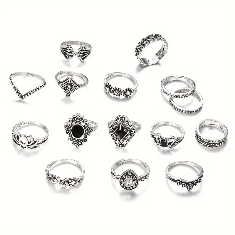 Boho-Chic 15pcs Ring Set with Vintage Silvery for Lotus Design - Alloy, Cubic Zirconia Accents for Everyday & Party Wear