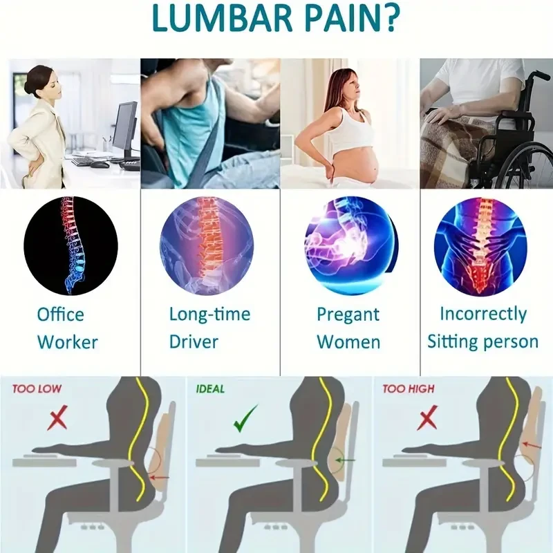 Memory foam back support pillow with adjustable straps. Ideal for office chairs, car seats, and gaming chairs.