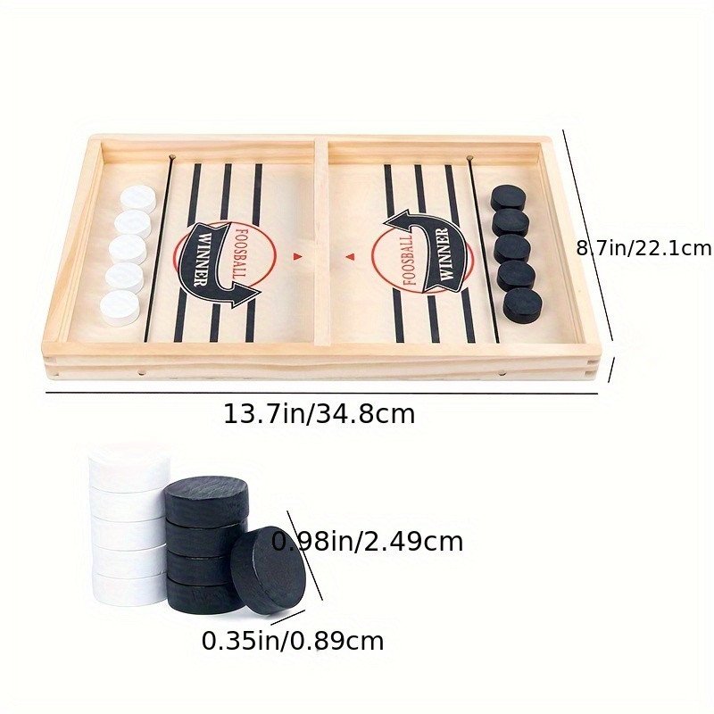 A fast-paced hockey puck slingshot game made of wood, perfect for family interaction and parties.