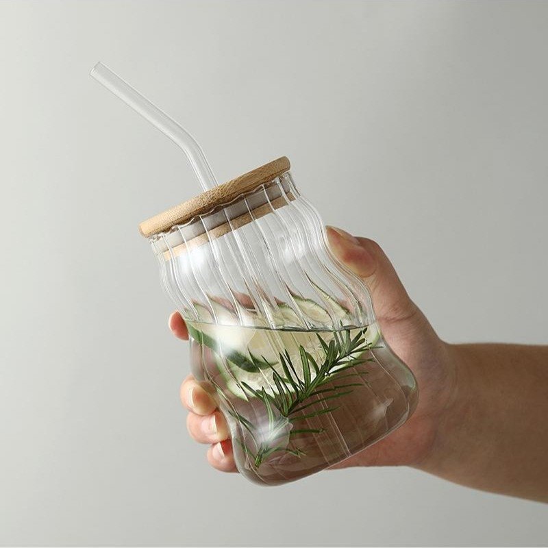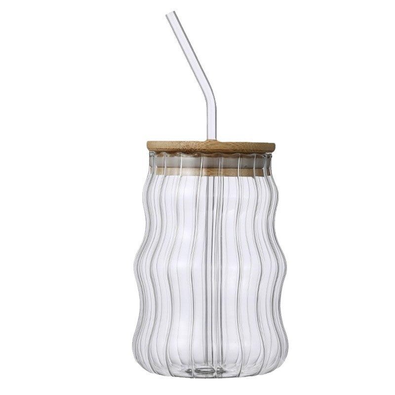 Hot Selling Glass Iced Coffee Cups Cute Irregular Ribbed Chubby Tumbler Latte Cup Beverage Glasses with Bamboo Lid and Straw