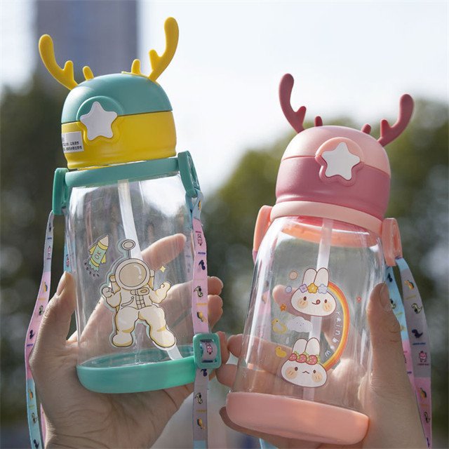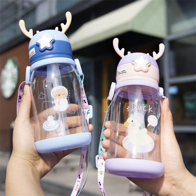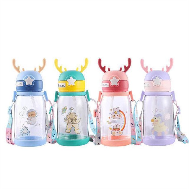 J615 Portable Cute Cartoon Children Water Bottle Deer Horn Silicone Straw Plastic Cup Straps Water Cup For Girl