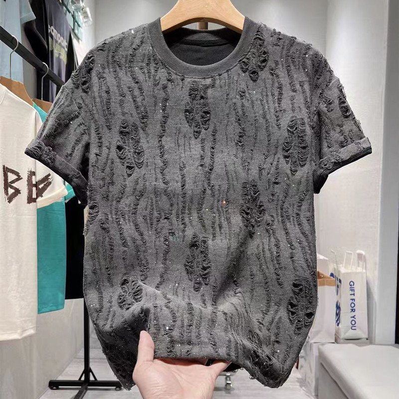 Men's Retro Distressed T-shirt, Torn T-shirt, Summer Loose Round-neck Short-sleeved Fashionable Rhinestone T-shirt