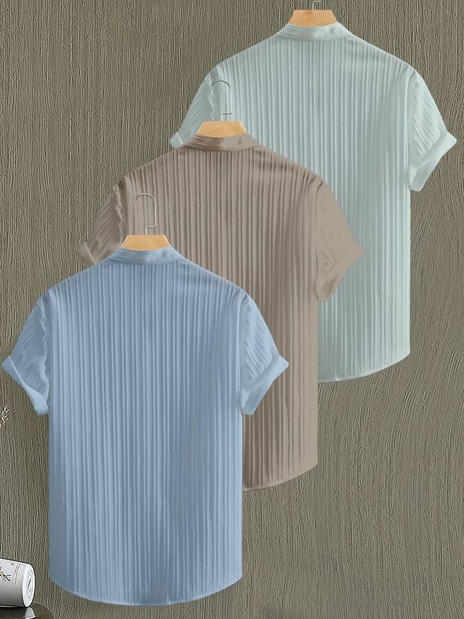 Men's Summer 3pcs Solid Color Short Sleeve Stand Collar Shirt, Breathable Comfort Fabric Button-Up Top, Casual Fashion Versatile Shirts for Casual Attire, Beach Vacation Set of 3