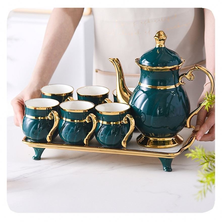 New Luxury 8Pcs Arabic Gold Rim Porcelain Coffee Tea Cup Set With Teapot Tray Ceramic Tea Cup Set