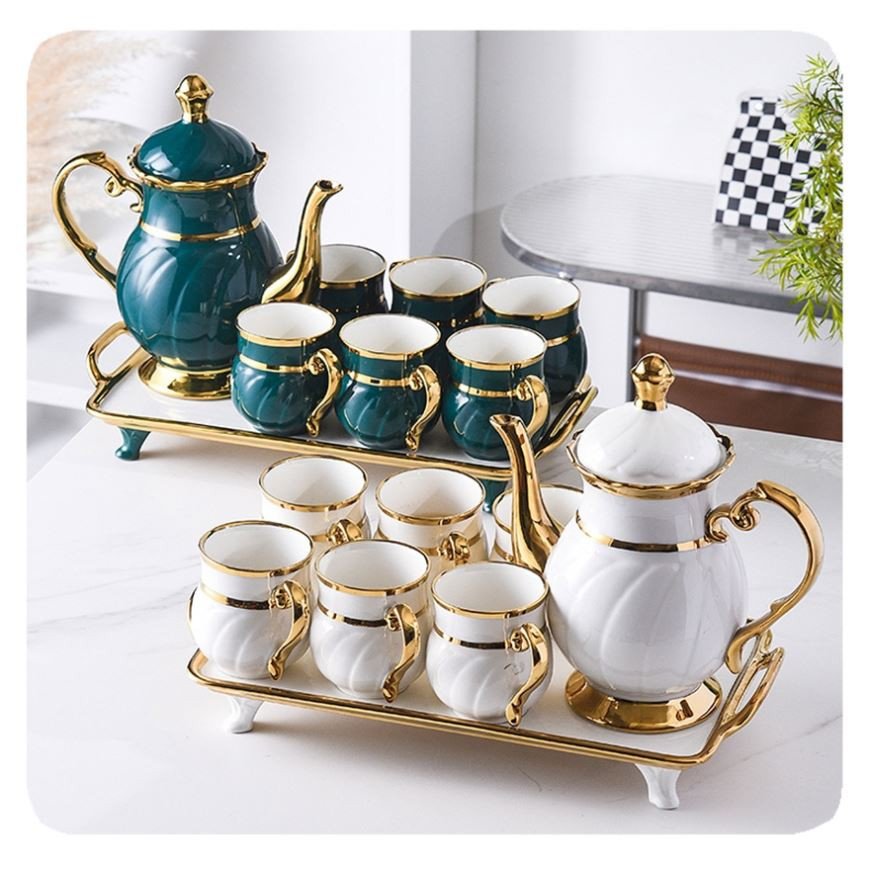 New Luxury 8Pcs Arabic Gold Rim Porcelain Coffee Tea Cup Set With Teapot Tray Ceramic Tea Cup Set