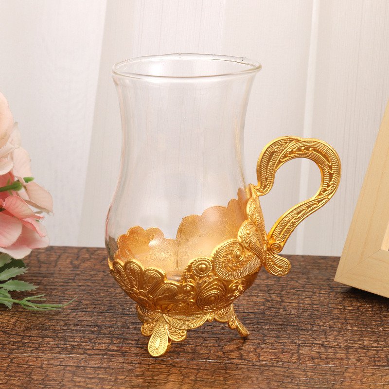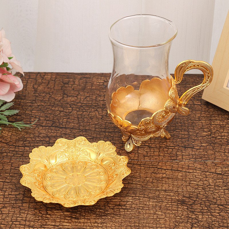 New Modern European Style Tea Cup Saucer Set Zinc Alloy Elegant Coffee Milk Cup Dry Fruit Arab Serving Tray Set with Handle Lid