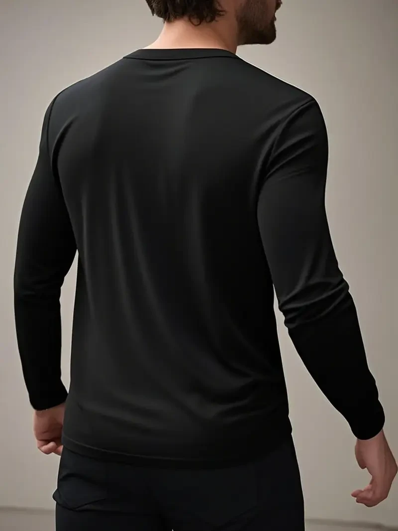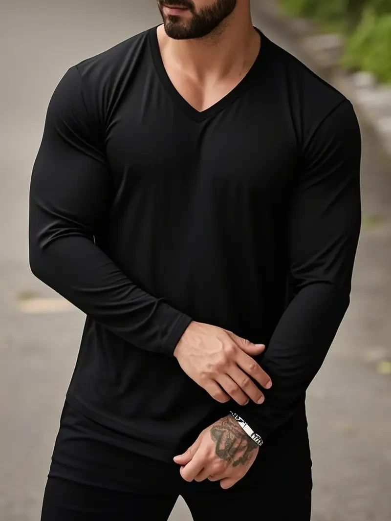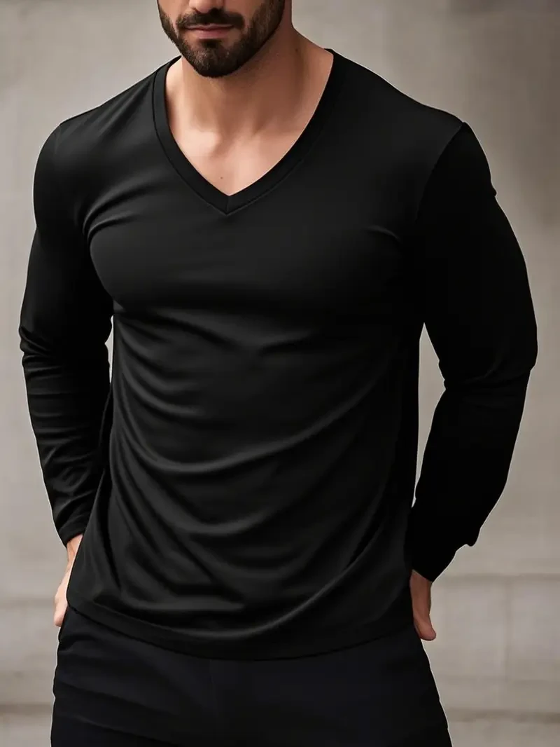 Suji & Sijidou Elastic Comfort Long Sleeve V-Neck T-Shirt - Solid Color Top for Men, Simple Spring/Autumn Style